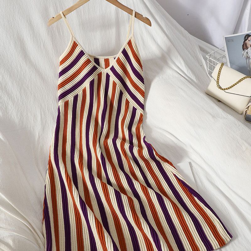 スパゲッティストラップサマードレスセクシーホリデービーチコントラストニットストライプドレス Vestidos デ Y2k 夏物