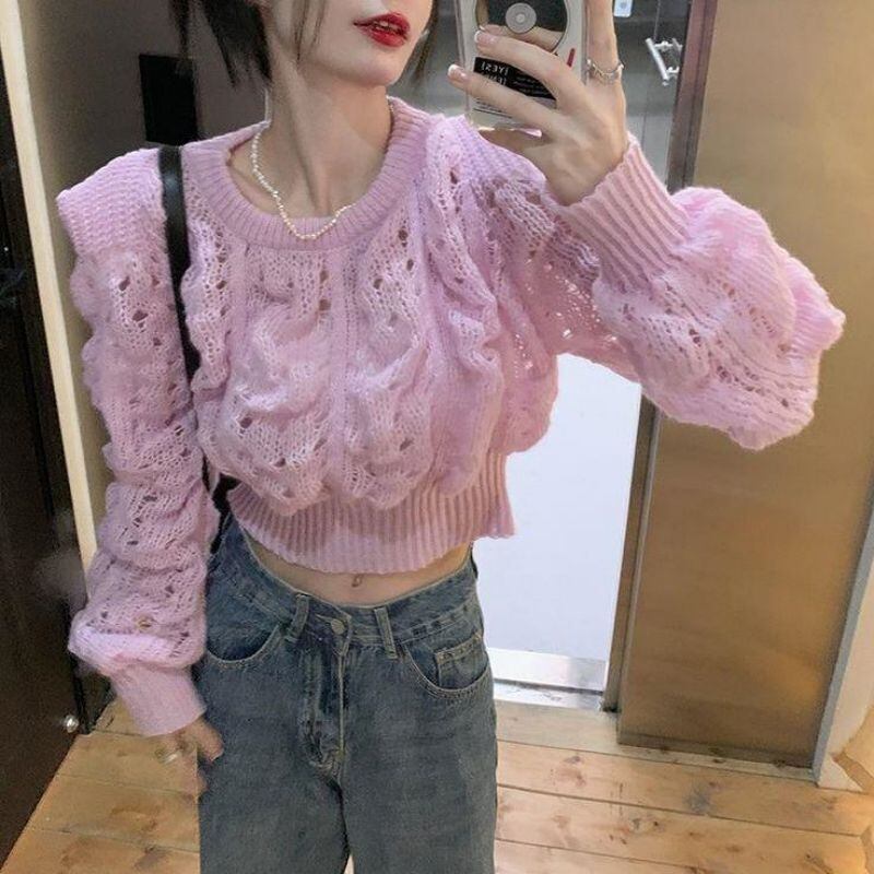 ニットセーターソリッドクルーネック中空アウトバブルスリーブホワイトニットセータートップレディースジャンパースプリングセーター 春物 ソリッドカラー
