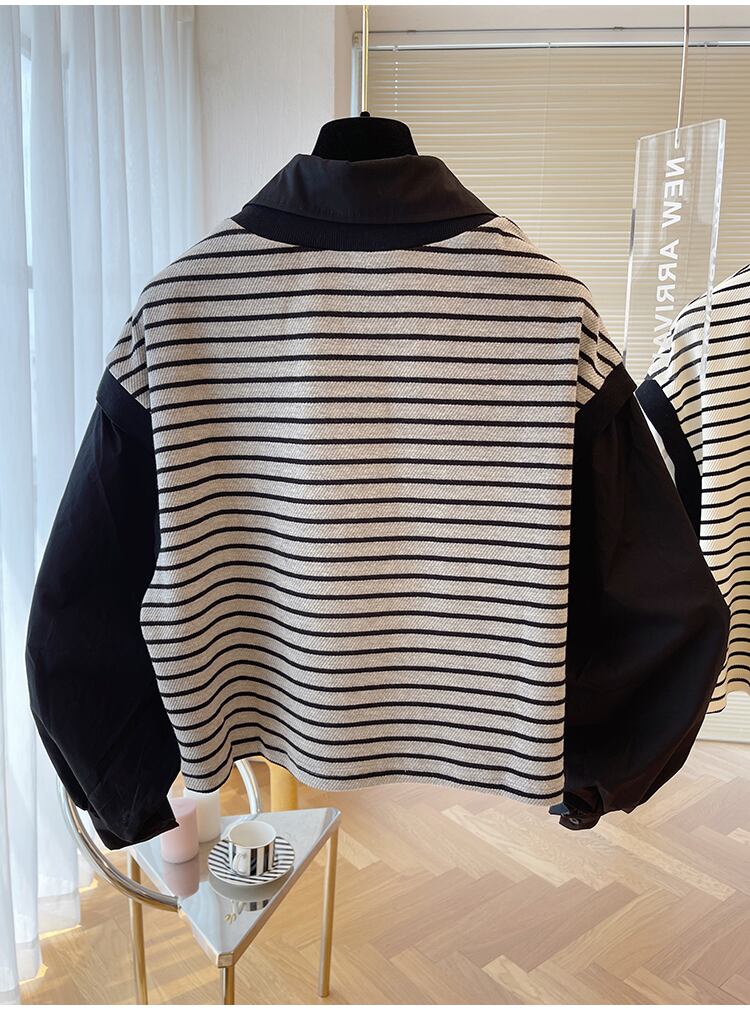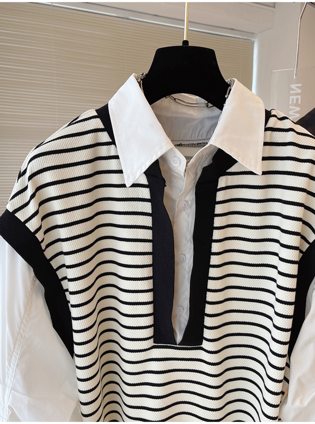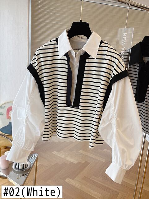 フェイク 2 白ストライプ シャツ春ルーズ ニット セーター ベスト シャツカミーサ ブラウス ホワイト スプリング 春物