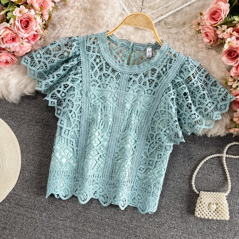 宮殿スタイルクロップトップ無地半袖かぎ針編みブラウス夏中空白レースシャツピンク人形 ショート ホワイト ハーフスリーブ サマー 夏物 ソリッドカラー