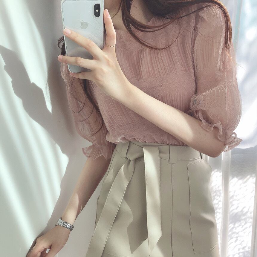 シャツパフ半袖トップスカミーサ夏甘いプリーツ薄ピンクシフォンシャツブラウス Blusa ショート ハーフスリーブ 大人ガーリー スウィート キュート カジュアル サマー 夏物