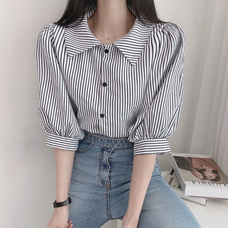 トップス 万能ラペル シングルブレスト ルーズ バブルスリーブ ブルー ストライプシャツ ブルーサ ショートブラウス サマーシャツ 夏物