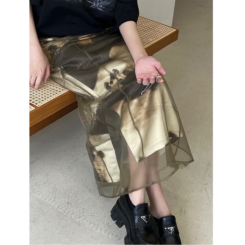 スタイル段 Faldas Largas メッシュプリントレトロ絞り染めスカート A ラインミディロングスカート Y2k セクシー Aライン