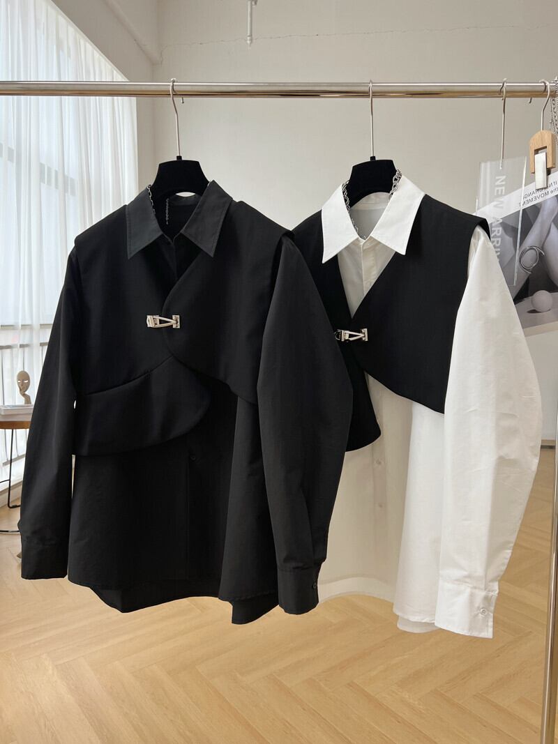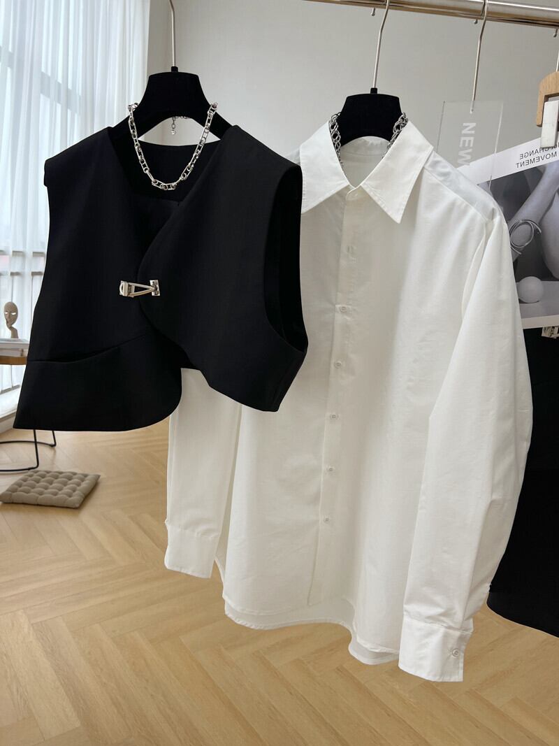 Y2k 黒セーターベストシャツ秋スーツストリートルーズホワイトブラウスデモーダシャツ ブラック オータム 秋物