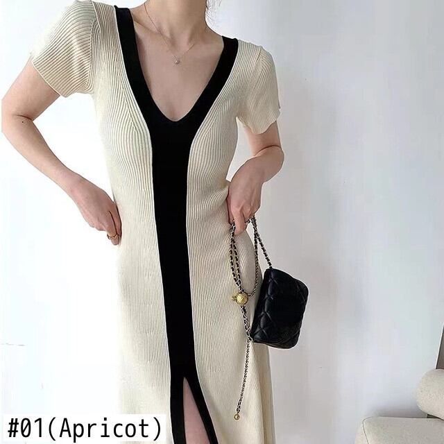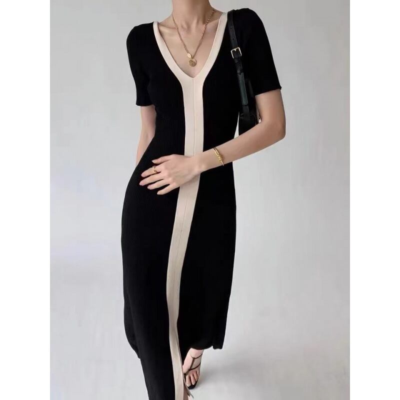 気質 V ブラック ホワイト コントラスト アイス 半袖ニット ドレス Vestidos マキシ誕生日セーター ドレス ショート ハーフスリーブ シルク