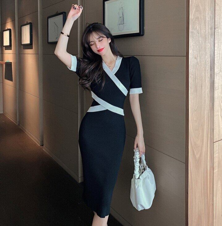 ニットワンピ Vネック クロス イレギュラーウエスト スリム ボディコン 半袖 セータードレス セクシー サマードレス パーティー ゴム ペンシル ショート ハーフスリーブ エラスティック 伸縮 夏物
