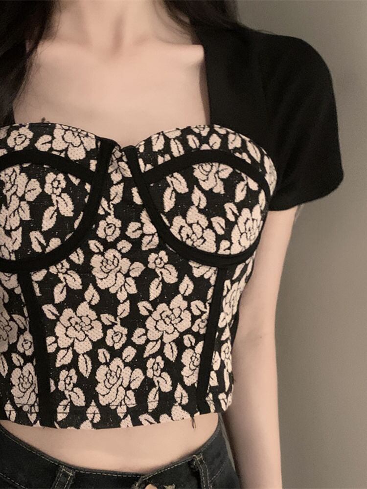 シャツ夏美的 Tシャツ Y2k トップセクシースリムコントラスト黒花柄 Tシャツグラフィック Tシャツクロップスクエア ブラック サマー 夏物 スクウェア