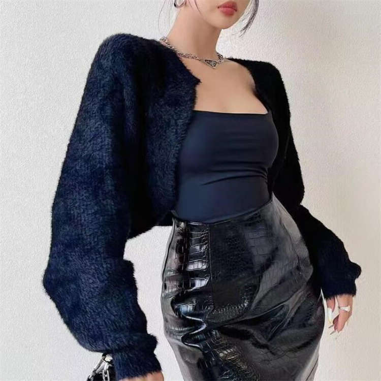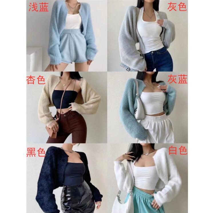 グレーミンクカシミヤカーディガン秋ショートショールジャケットボタンレスセーターニットクロップドカーディガン オータム 秋物