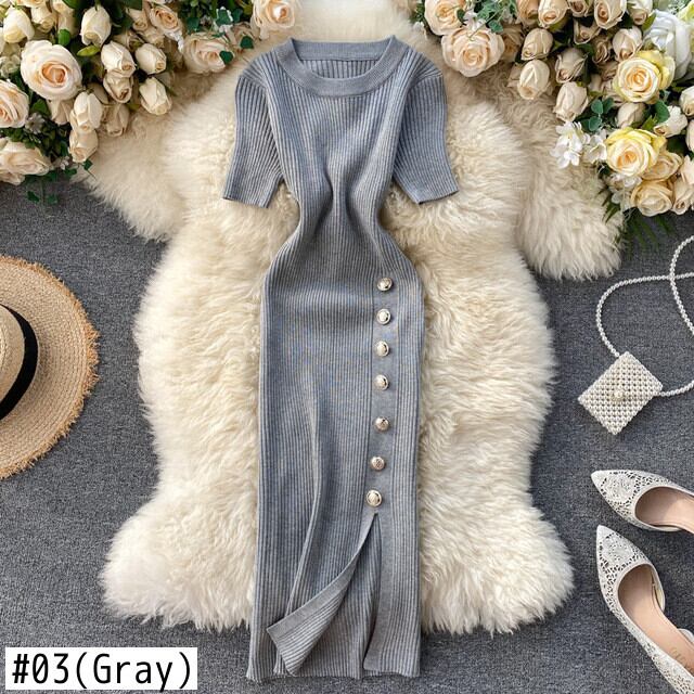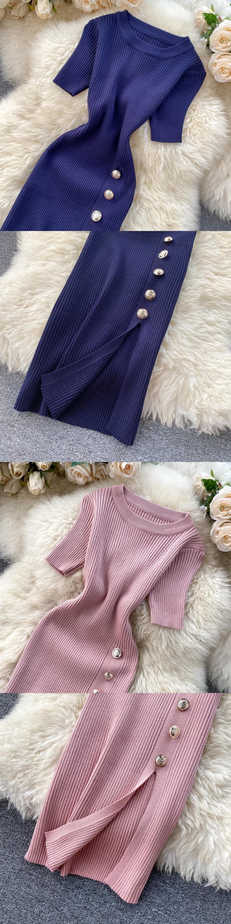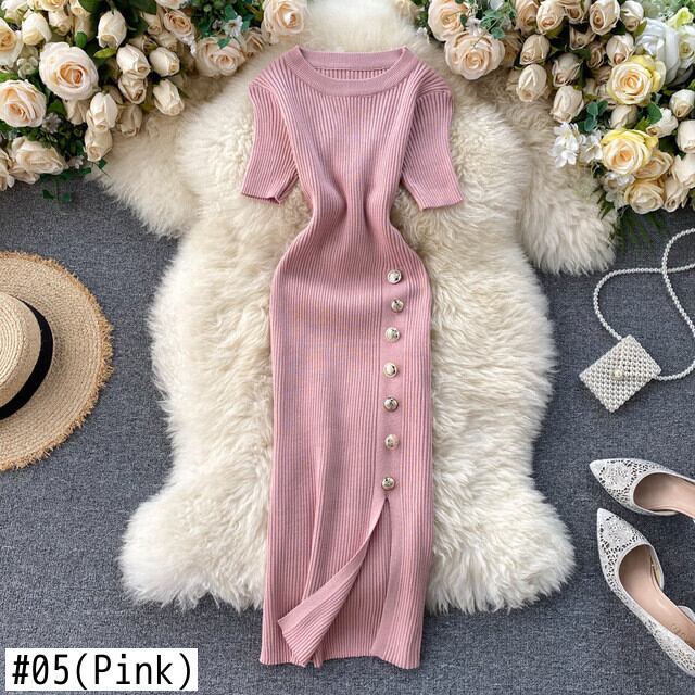 Vestidos De Split ラップ シンプル 無地 シングルブレスト スリム ピンク 半袖 ニット ワンピース レディース 夏 ワイルド ショート ハーフスリーブ サマー 夏物 ソリッドカラー