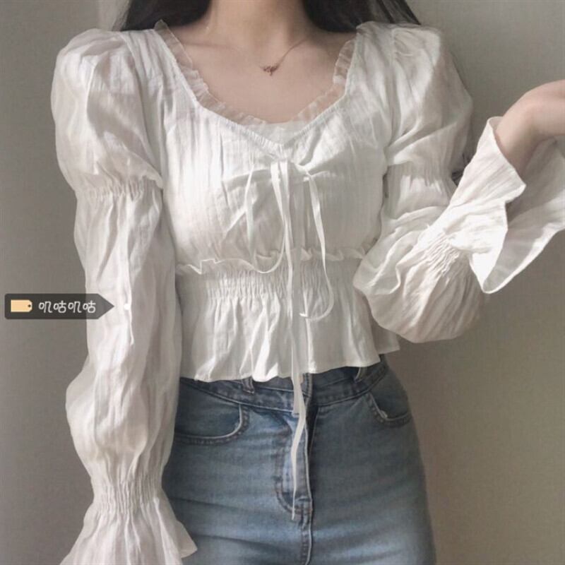 クロップトップスフレンチコートスタイル長袖白シャツスリム春ブラウスセクシーシャツ ロング ホワイト スプリング 春物