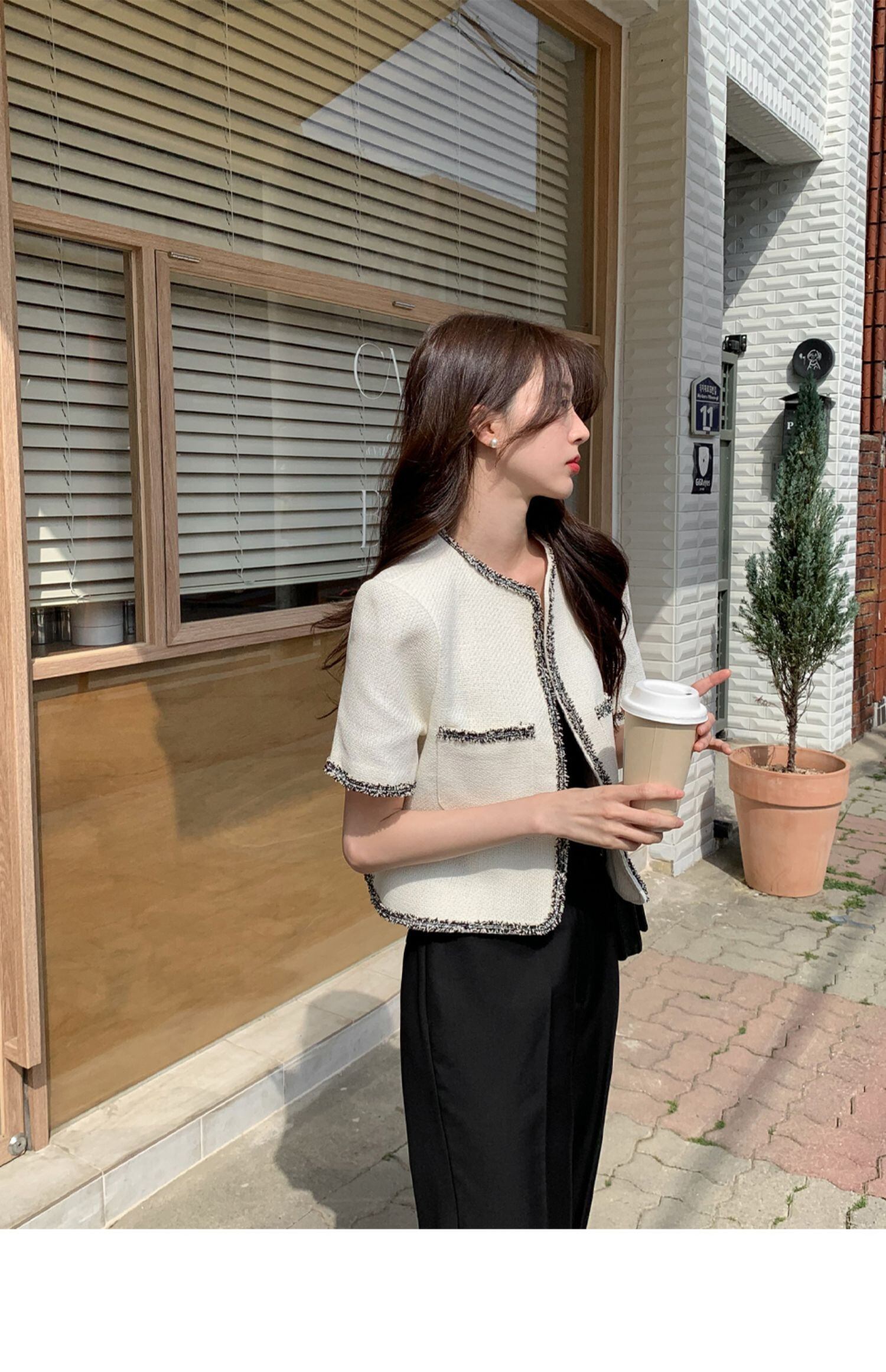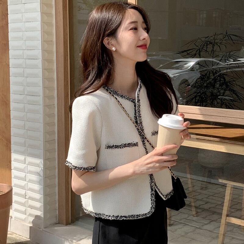 夏レトロクルーネックブラックホワイトコントラストショートツイードコートchaquetasスリーブジャケットスーツカーディガン サマー 夏物