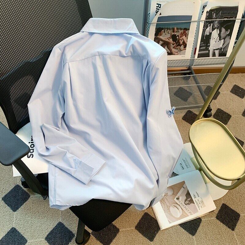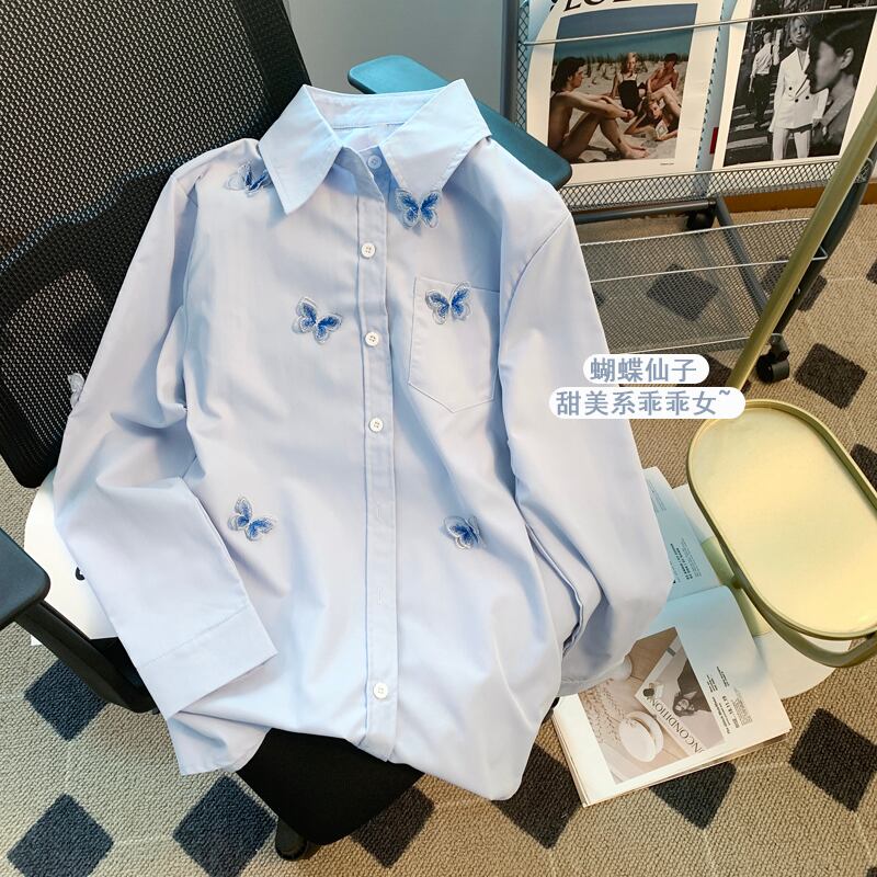 長袖刺繍ブルー蝶シャツ Roupas s ルーズトップス春ブラウス ロング レッド スプリング 春物