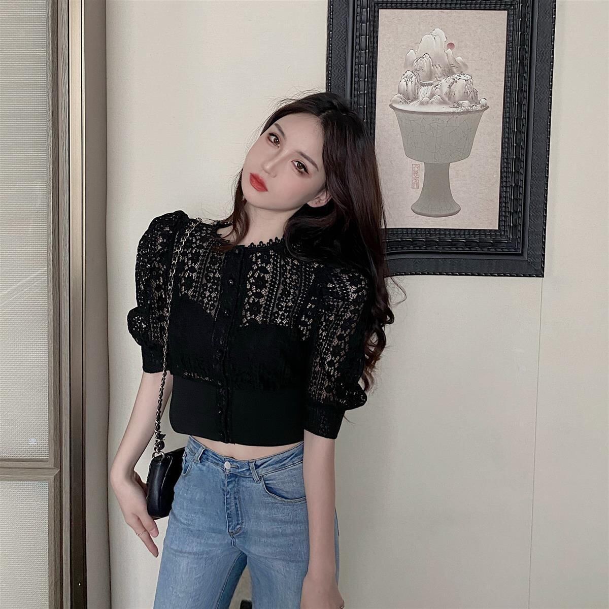クルー中空アウトかぎ針編み白レースシャツ夏クロップトップ半袖ブラウススリムセクシートップスシャツ ショート ホワイト ハーフスリーブ サマー 夏物
