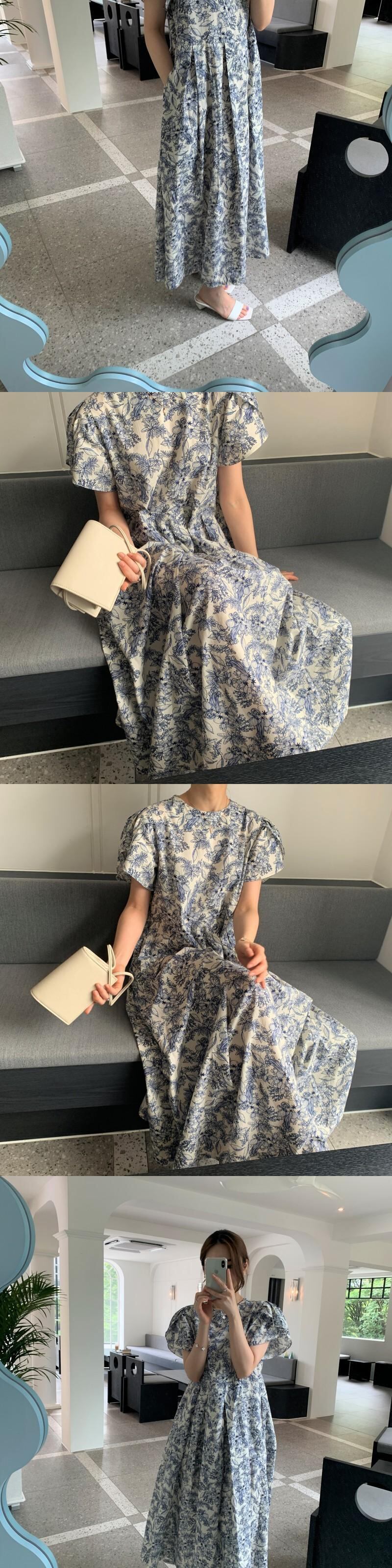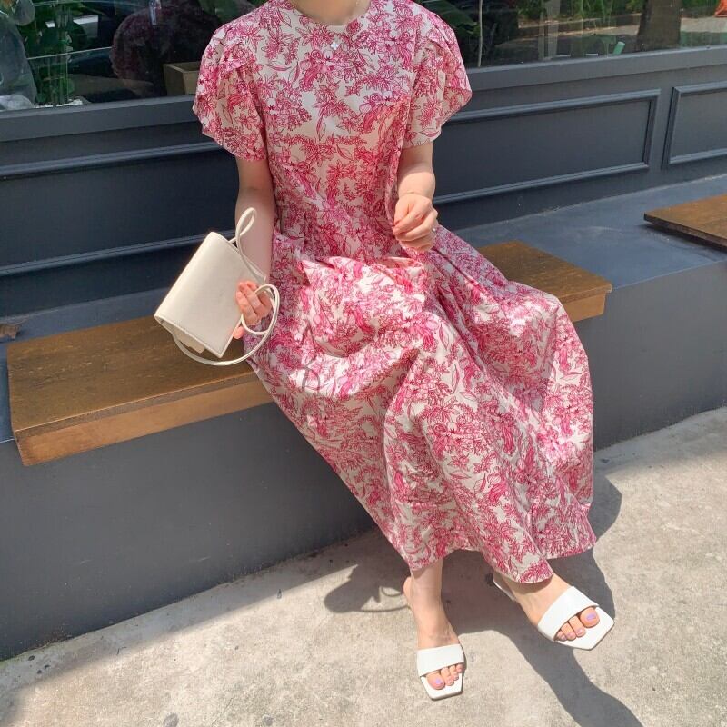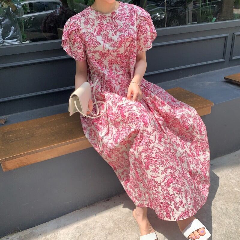 大きいスイング ネック コントラスト花柄プリント バブル半袖ブルー インク ドレス サマー ドレス Y2k Vestidos パーティー ショート ハーフスリーブ 夏物
