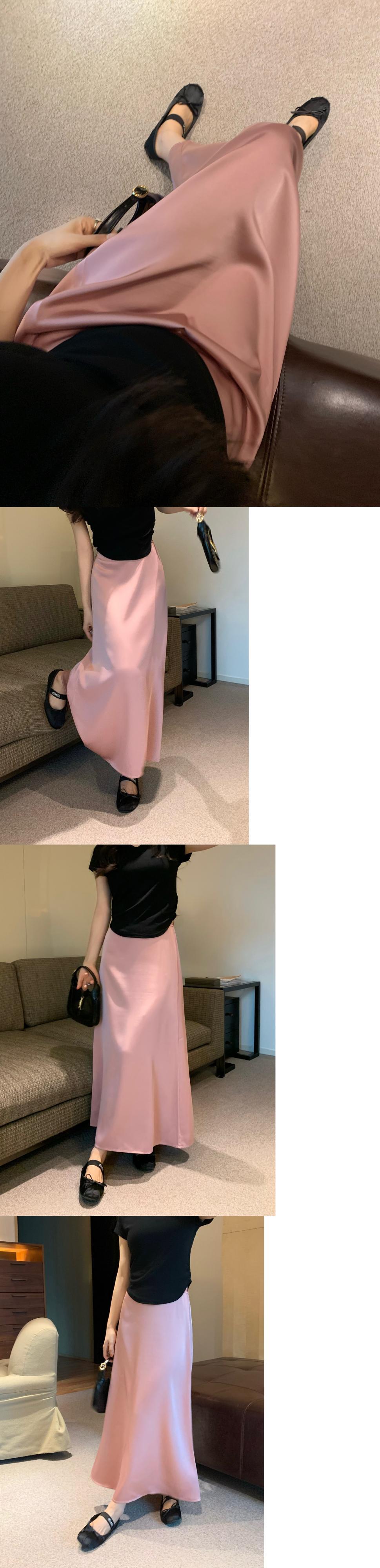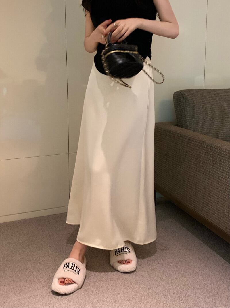 気質黒サテンスカートレディースOLファルダラルガス無地春ワイルドミディロングモーダ ブラック スプリング 春物 ソリッドカラー