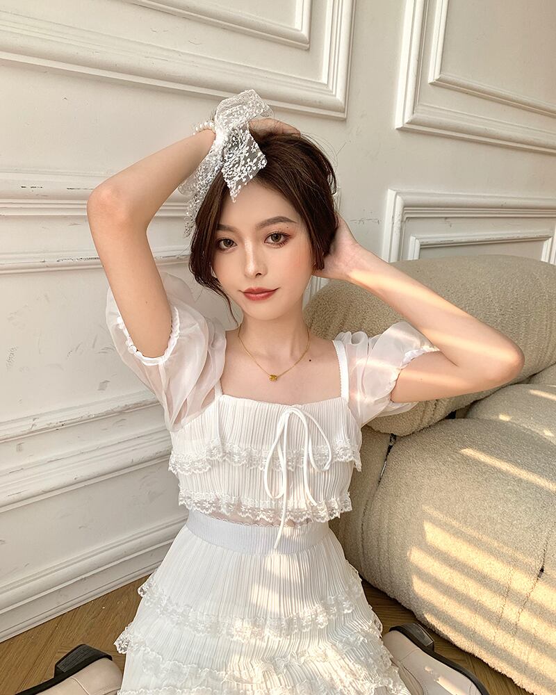 フェアリースクエアネック半袖バックレスメッシュステッチレースケーキドレスミニ Vestido 甘い優しい白夏フリル ショート ホワイト ハーフスリーブ ラッフル 大人ガーリー スウィート キュート カジュアル サマー 夏物 スクウェア