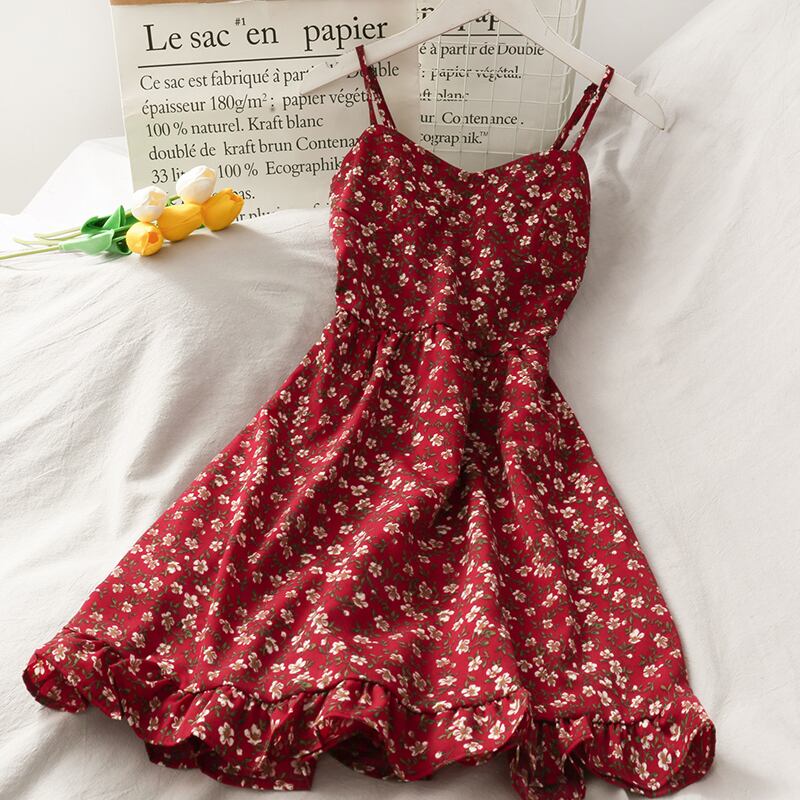スリムウエストサスペンダーフローラルドレスフリルミニプリントローブビーチドレス Vestidos ストラップ 花柄