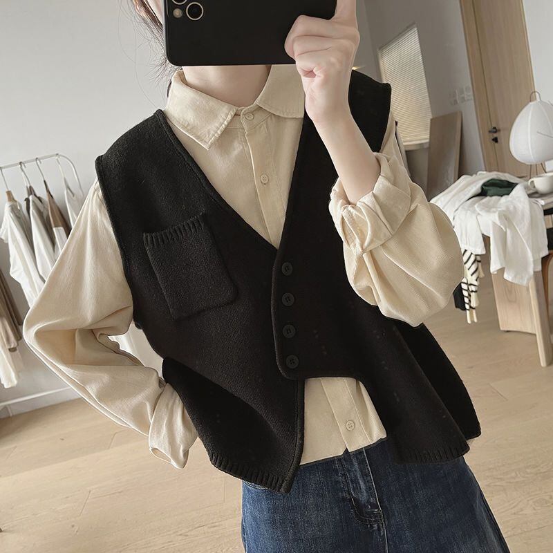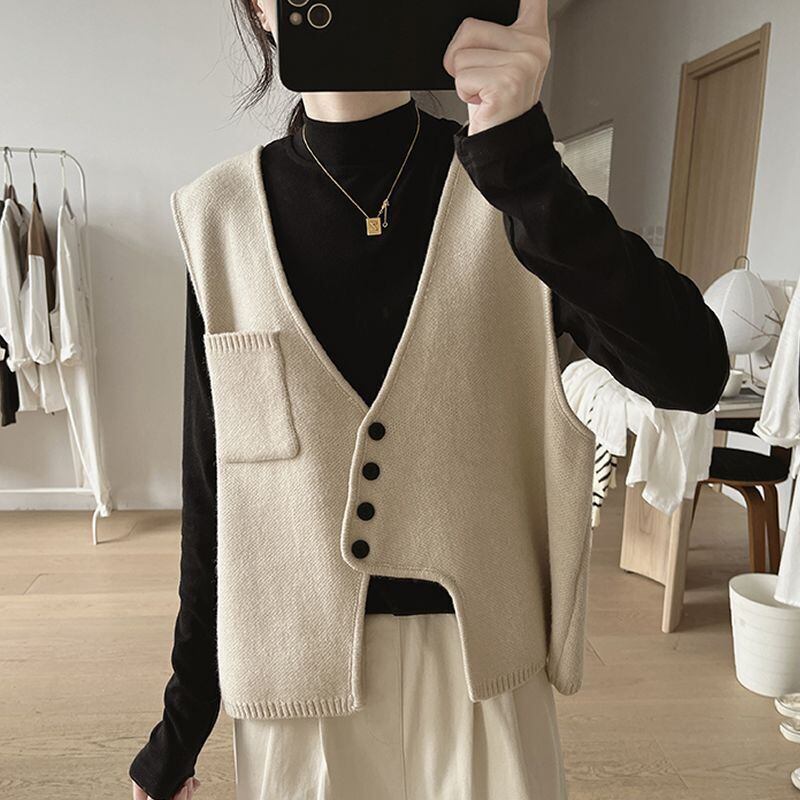 非対称シック Y2K ストリートノースリーブボタンニットカーディガンジャケット春秋ルーズ V ネックセーターベストトップス スプリング 春物 オータム 秋物 Vネック