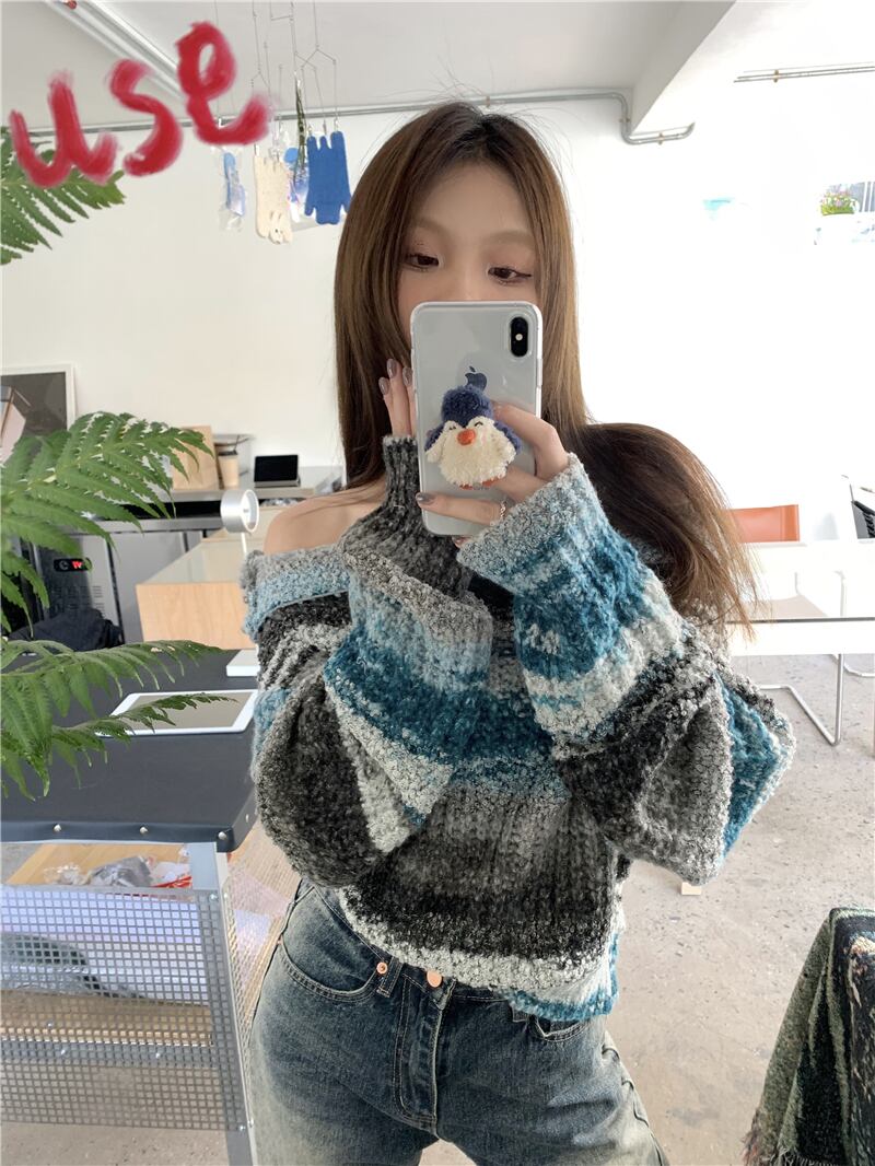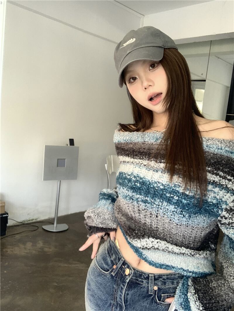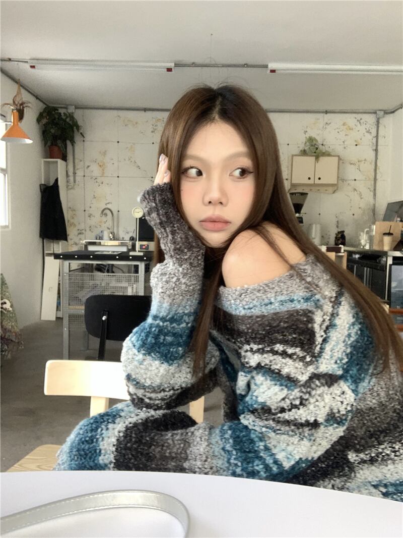 スラッシュ Y2k プルオーバーオフショルダー油絵セーターセーターストライプニットセータージャンパートップスプリント