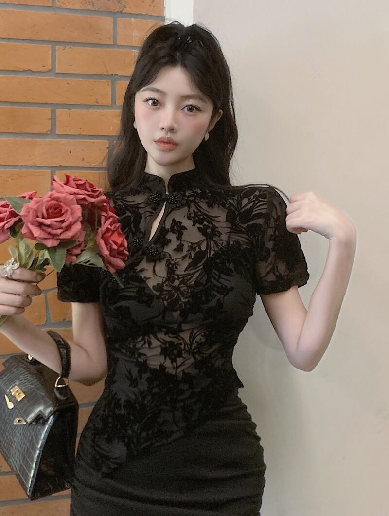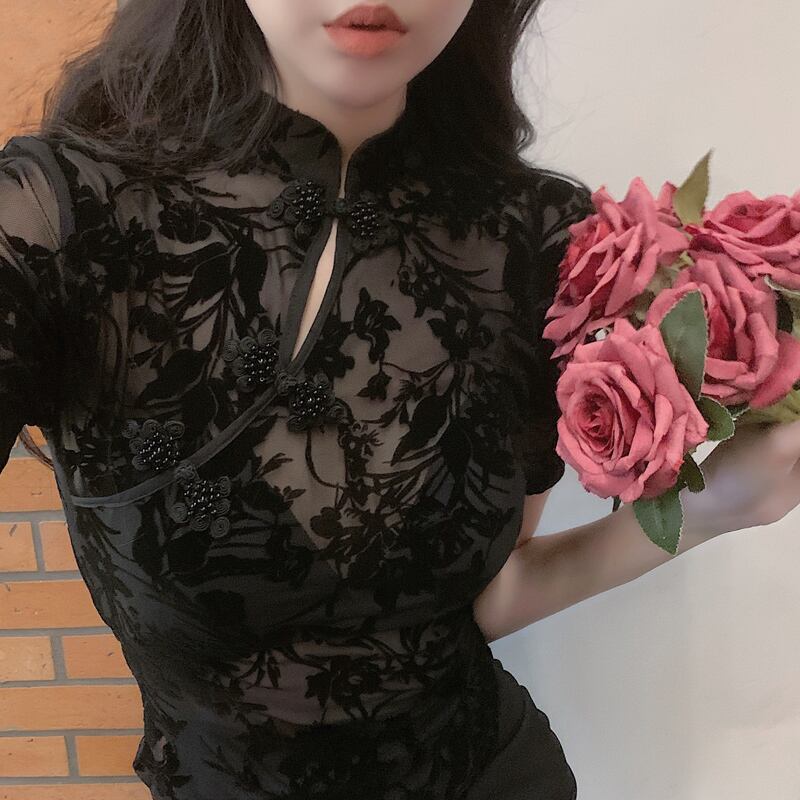 セクシー黒チャイナ シャツ Y2k スタンド透視レース シャツスリム ブラウス夏パフ トップス ブラック サマー 夏物