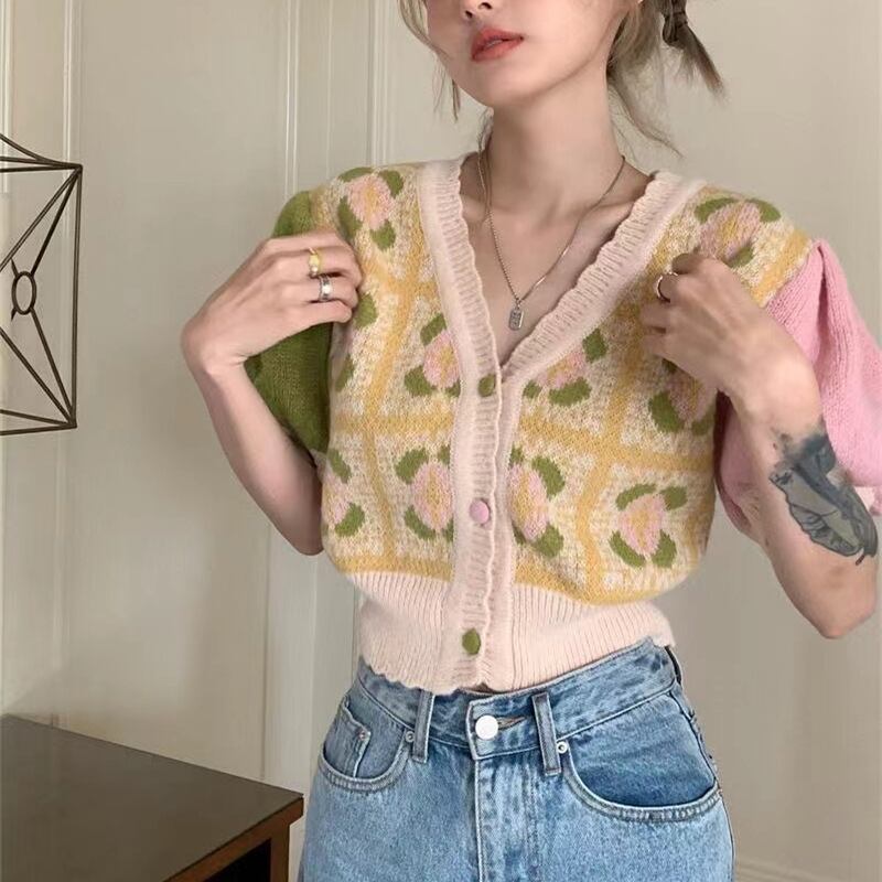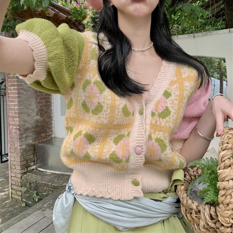 Vネック半袖ニット花柄カーディガン甘夏カーディガンボタンセーターセーターY2kクロップトップスプリントフラワー ショート ハーフスリーブ 大人ガーリー スウィート キュート カジュアル サマー 夏物 フラワーデザイン
