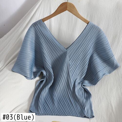 ゆったり Vネック ミニマリスト Tシャツ バットスリーブ プリーツ 春夏 無地 半袖 トップス ブラウス シャツ ショート ハーフスリーブ スプリング 春物 サマー 夏物 ソリッドカラー