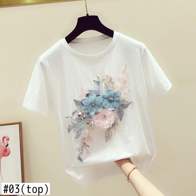 2 個セットレディース衣装白刺繍 3D 花半袖 Tシャツ夏トップ花柄デニムショーツ Y2k Tシャツ ショート ホワイト レッド ハーフスリーブ サマー 夏物 ブルマー フラワーデザイン