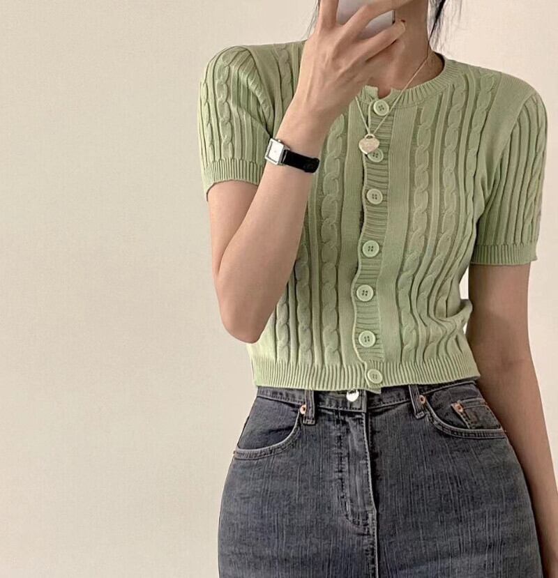 ニットセーターセーターグリーン半袖クロップドカーディガンスリムトップスニットツイストセーター Y2k 服 ショート ハーフスリーブ