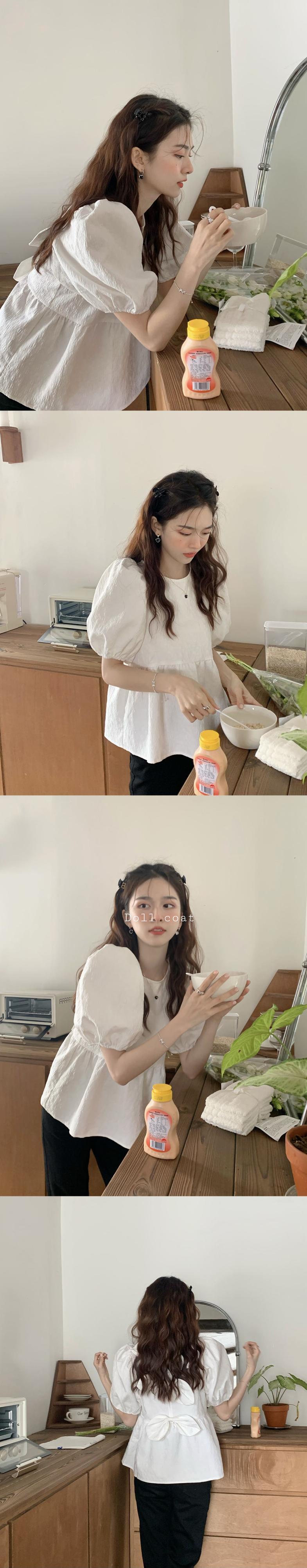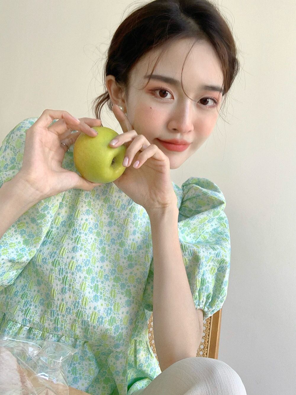 シックバックボウスウィートグリーンフローラルシャツ Blusa スタイルクロップトップ半袖ドールブラウスシャツ ショート リボン ハーフスリーブ 大人ガーリー キュート カジュアル 花柄
