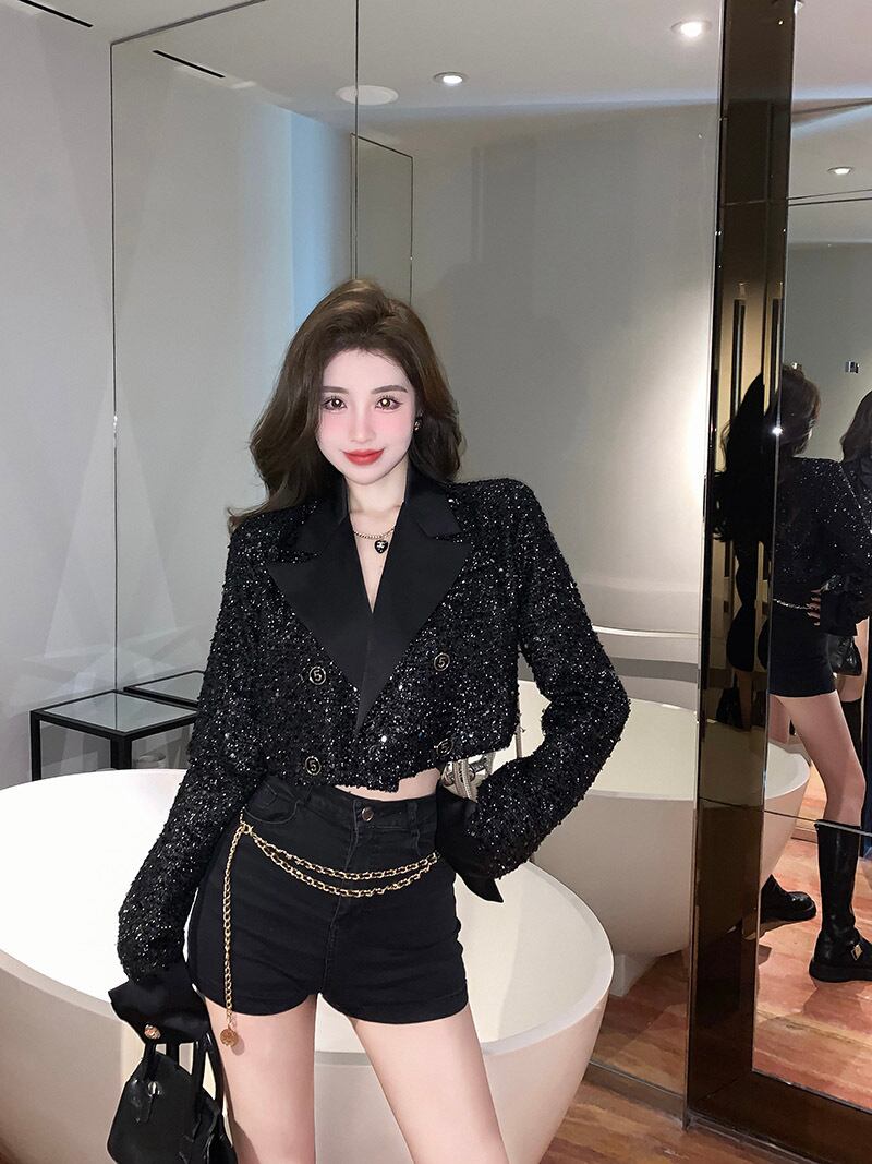 テーラード コート ダブルブレスト ショート ブラック スパンコール ブレザー Y2k 春ブレザー Feminino ストリート ジャケット ノッチ コート セクシー レッド スプリング 春物