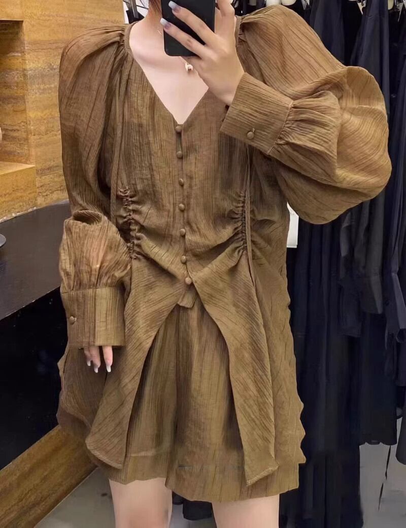 ルース V ネック巾着シャツ非対称トップス弾性ウエストショーツサンセットワイドレッグ 2 スーツ エラスティック 伸縮 ブルマー Vネック ワイドパンツ