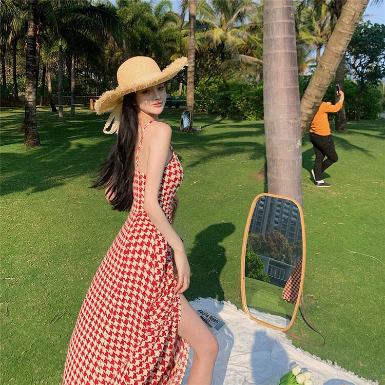 ドレスサスペンダードレス夏 A ライン黒千鳥格子ドレスレディー Vestido セクシービーチスタイルパーティー ブラック サマー 夏物 Aライン