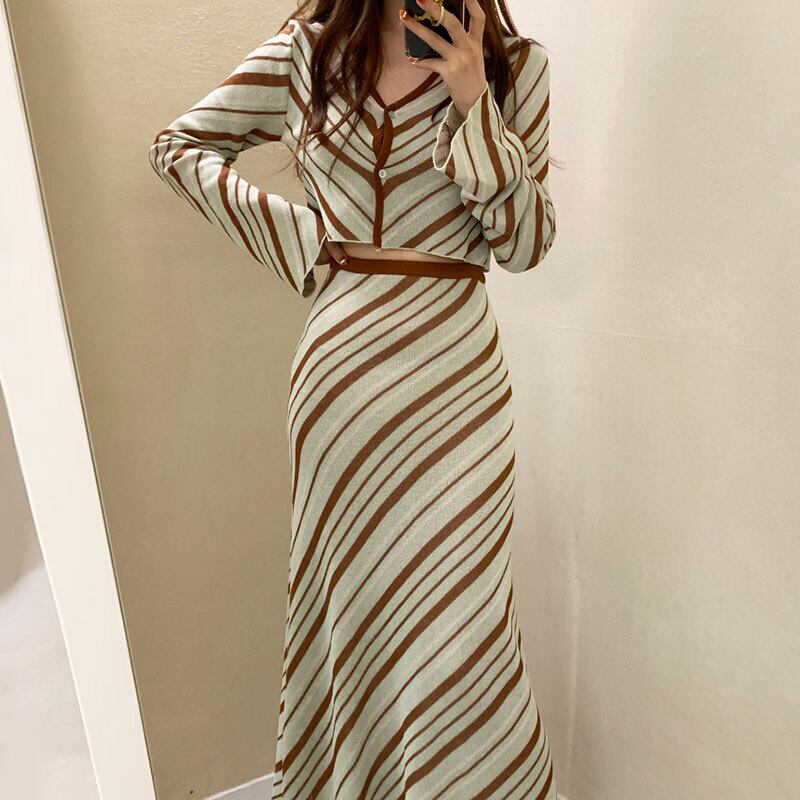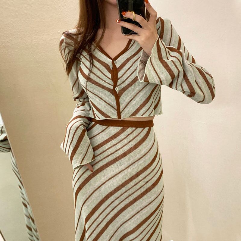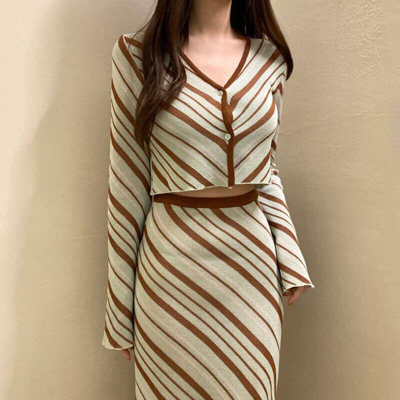 Vネッククロップドストライプカーディガントップニットウエストボディコンスカート2点セットレディース衣装Y2k春 スプリング 春物