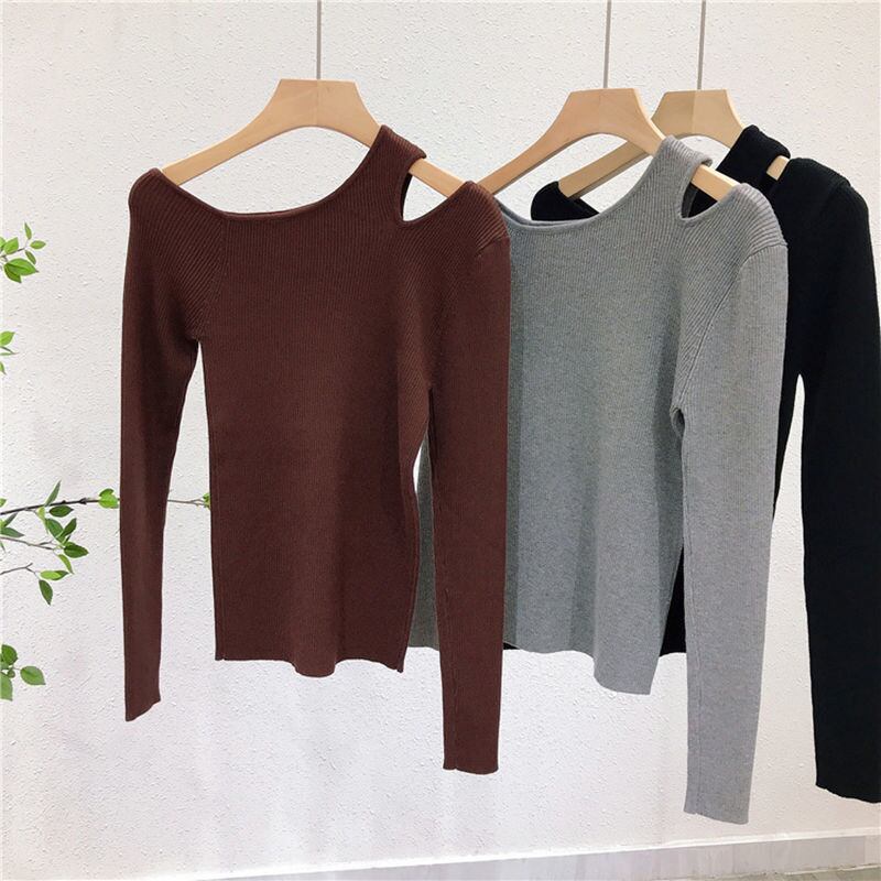 スリムジャンパーオフショルダー斜め襟セーター長袖ニットトップスシャツ黒セーターレトロ ロング ブラック