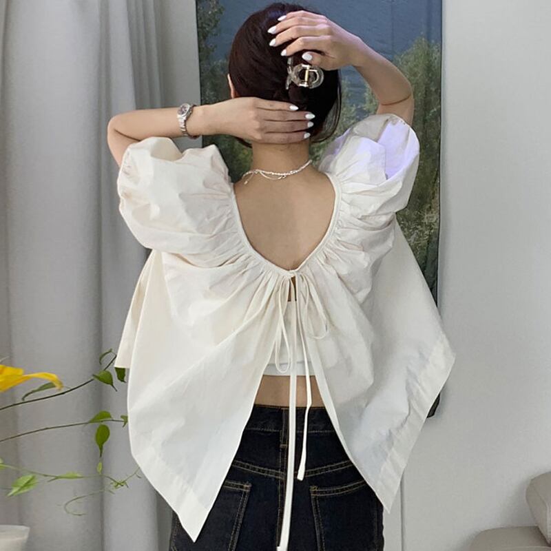ミニマリスト気質 O ネックプリーツバック包帯オープンバック半袖シャツ Blusa ホワイトドールトップス夏ブラウス ショート ハーフスリーブ サマー 夏物 Oネック