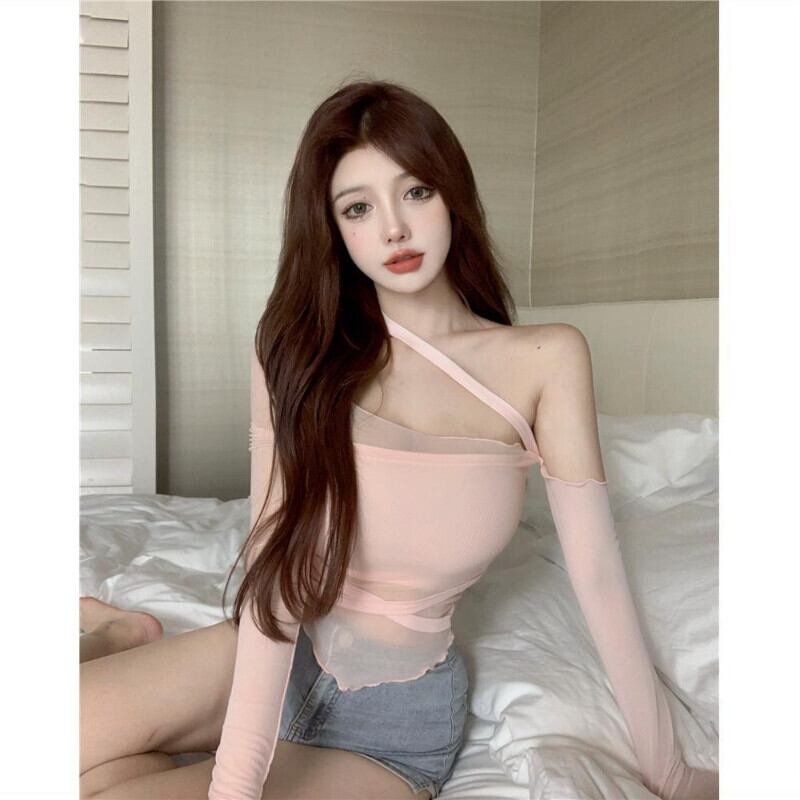 スリムホットクロップトップス包帯不規則メッシュ Tシャツグランジ春シャツピンク Tシャツオフショルダー Tシャツ スプリング 春物