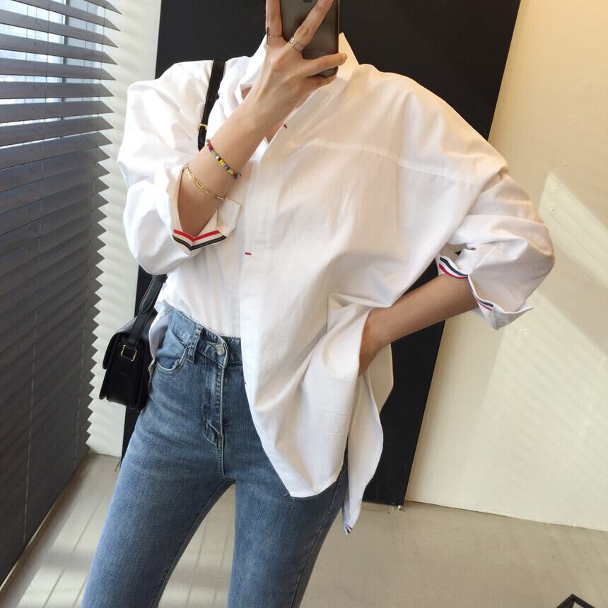 ブラウストップス長袖ストライプ白ターンダウン襟 OL シャツバックボタンゆるいフェミニン春シャツ ロング ホワイト スプリング 春物