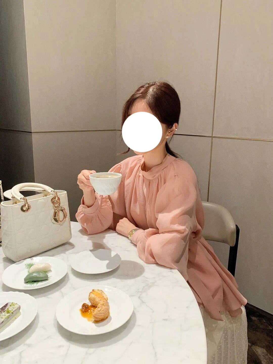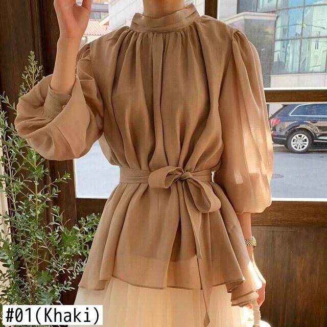 フレンチパレススタイルスタンド無地プリーツレースアップランタンスリーブシャツトップピンクシフォンブラウスシャツ ソリッドカラー