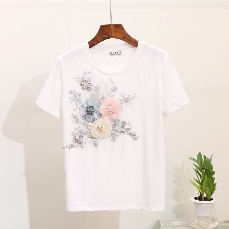 美的グラフィック Tシャツ白刺繍 3D 花 Tシャツワイド脚リッピングジーンズパンツセット 2 peice セット夏トップス ホワイト サマー 夏物 ワイドレッグ ワイドパンツ フラワーデザイン