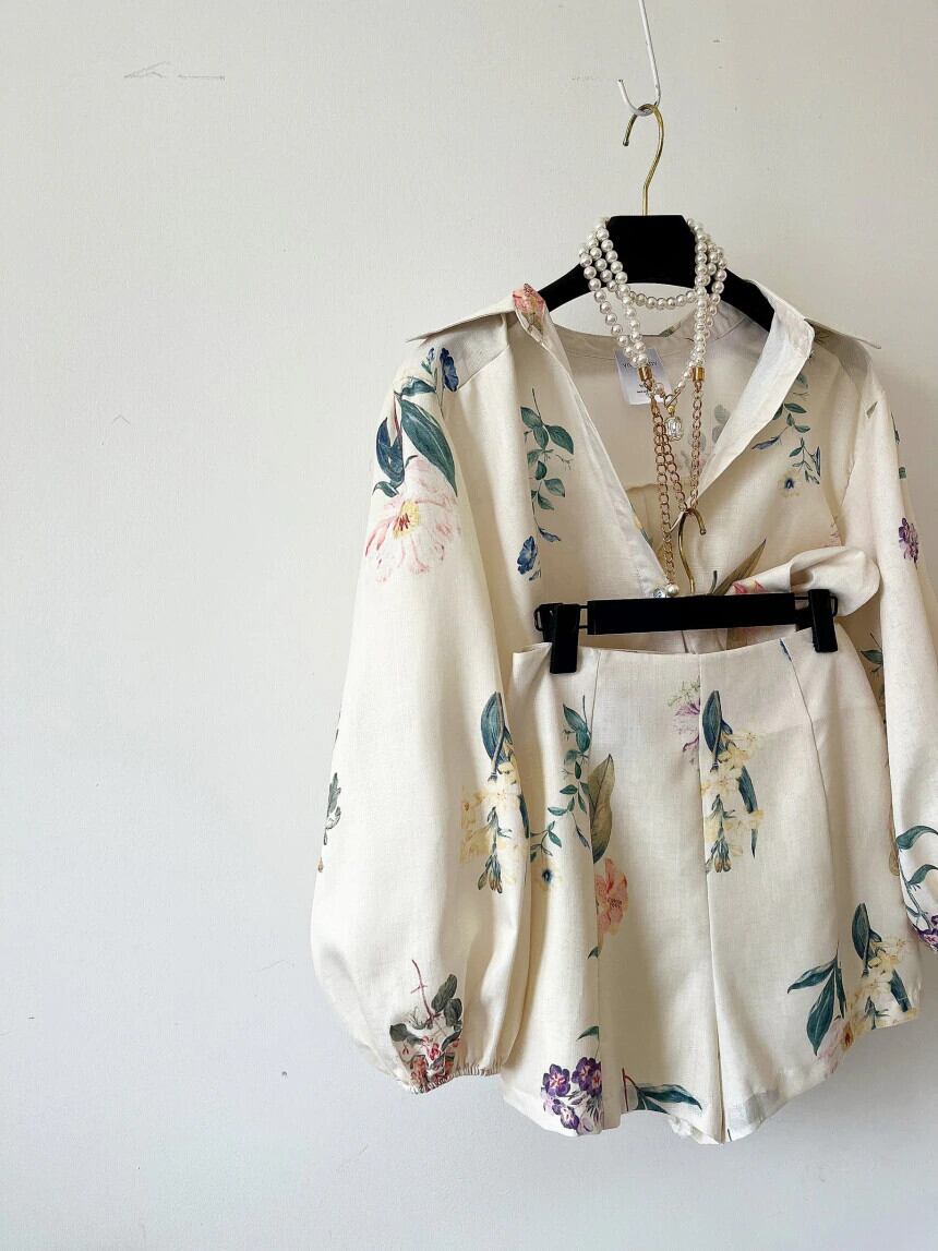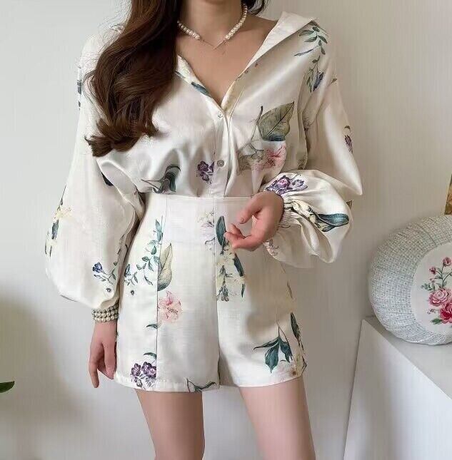 ツーピースセットレディース衣装気質ランタン長袖プリントシャツ花柄ウエストショーツセットビーチブラウストップス ロング ブルマー