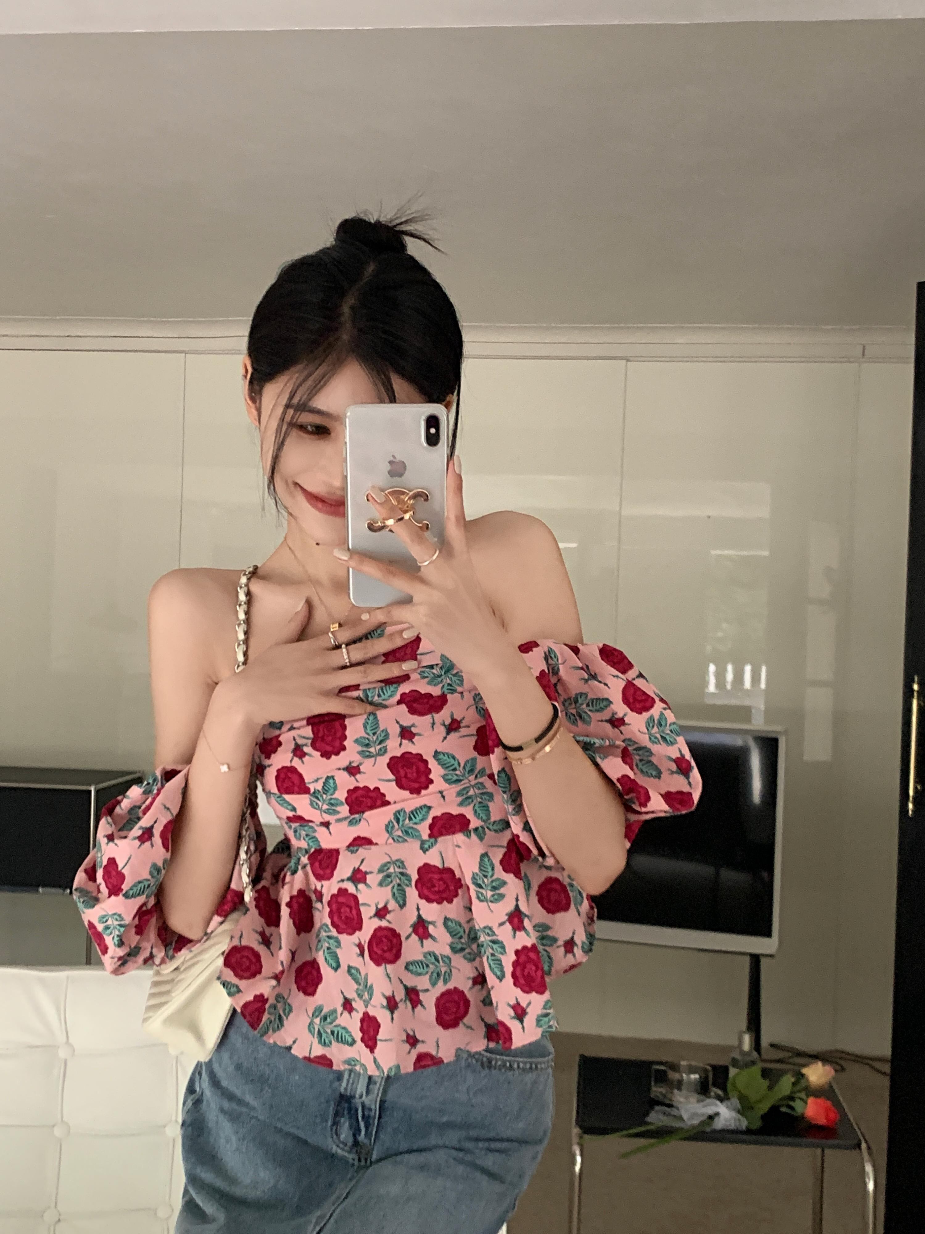 オフショルダー半袖シャツ夏花柄クロップトップスセンス甘いセクシーブラウス Y2k ショート ハーフスリーブ 大人ガーリー スウィート キュート カジュアル サマー 夏物