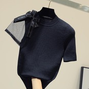 メッシュ弓スプライシング半袖黒プルオーバーセーターニット Tシャツセクシー Y2k トップグラフィック Tシャツシャツ ショート ブラック リボン ハーフスリーブ