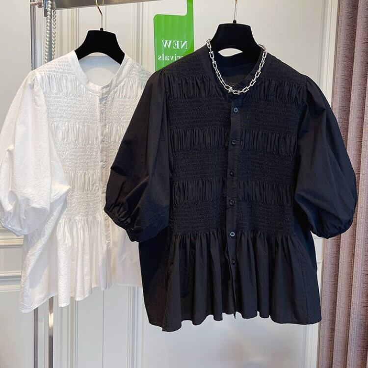シングルブレストシャツパフスリーブスタイル夏ルーズブラウスプリーツインホワイトトップス サマー 夏物 ソリッドカラー