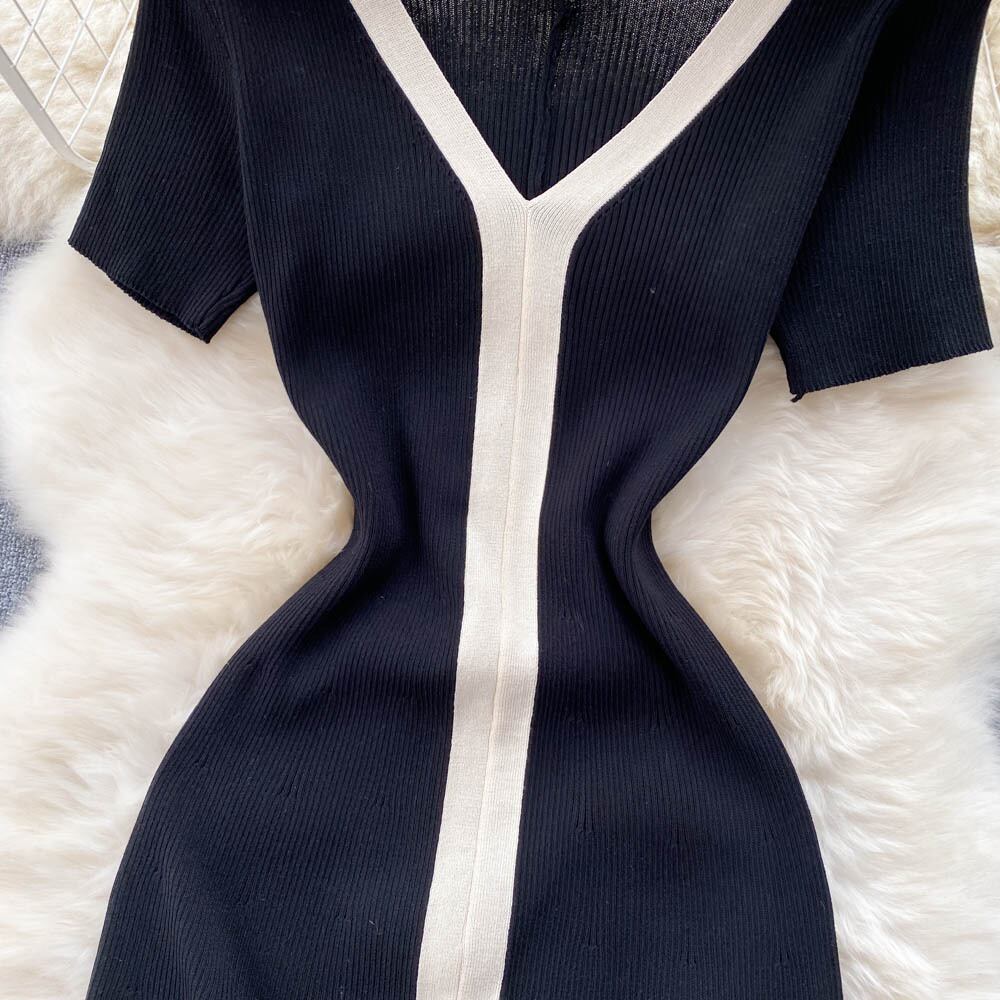 ルーズサマードレスコントラスト V ネック黒半袖ニットドレスローブ Vestidos ドレスパーティー ショート ブラック ハーフスリーブ 夏物 Vネック