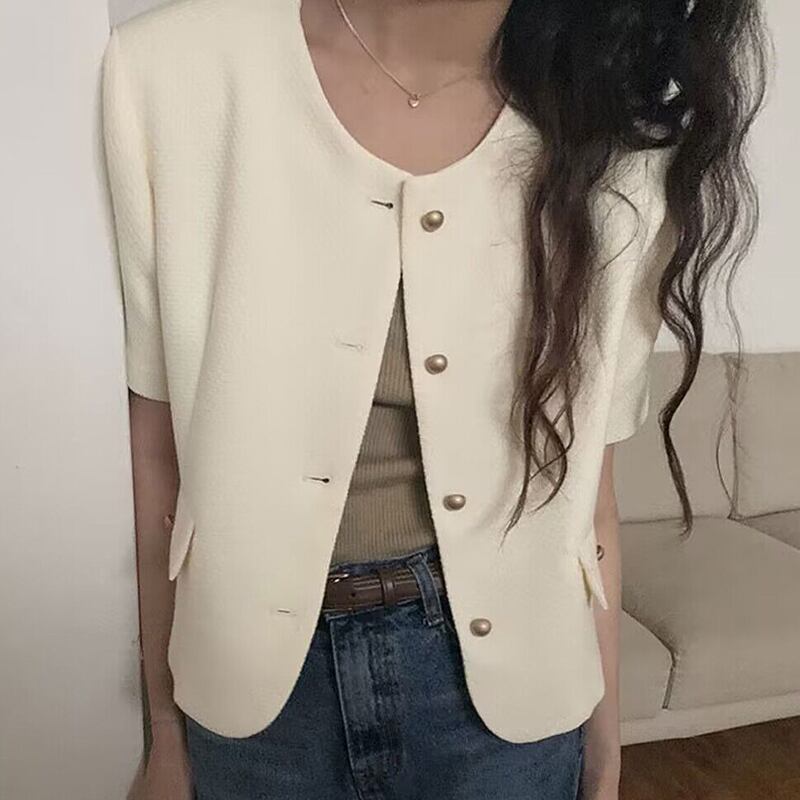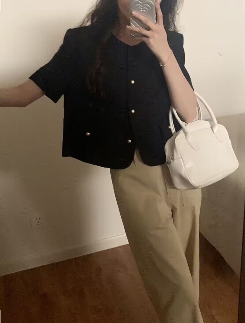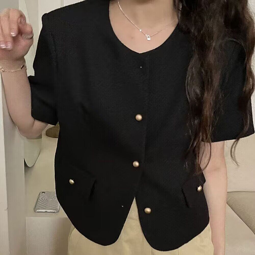 Chaquetas Jaquetas 気質ラウンドネックメタルボタンルーズ黒半袖ジャケット夏ブレザーシックカーディガン ショート ブラック ハーフスリーブ サマー 夏物 Oネック
