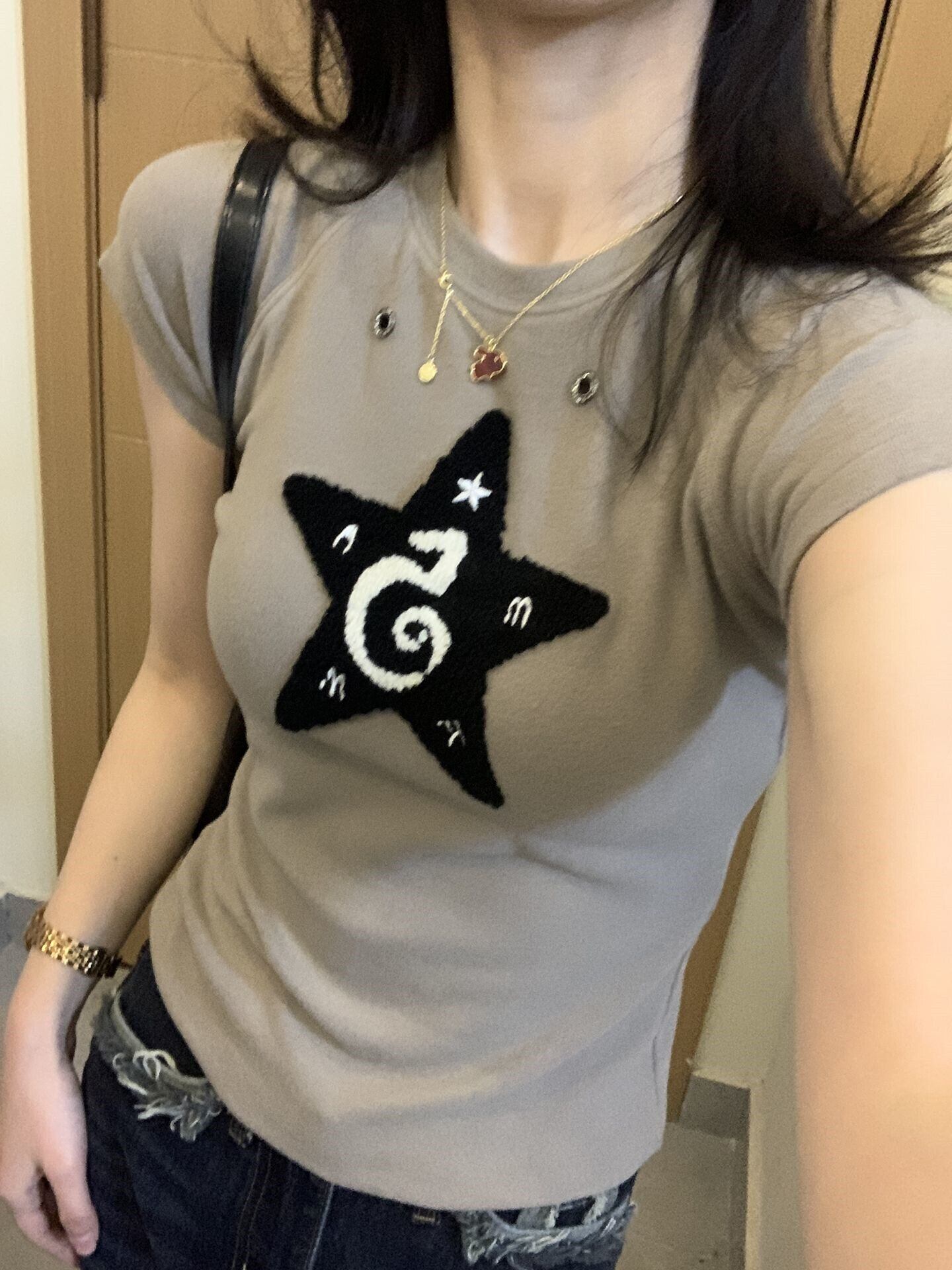 原宿グランジ服半袖 Tシャツグラフィック Tシャツ Y2k 美的刺繍スター Tシャツ Ropa デトップスセクシー Tシャツ ショート レッド ハーフスリーブ かわいい