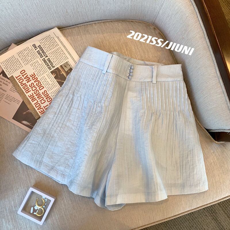プレッピー スタイル ルーズ ブルー シャツ Y2k トップス フリル ブラウス ワイドレッグ ショーツ 2 点セット レディース 服装 ブルマー ワイドパンツ