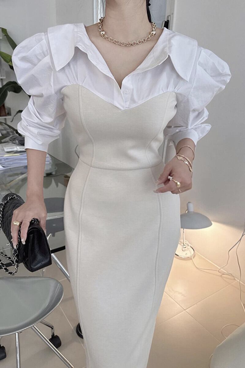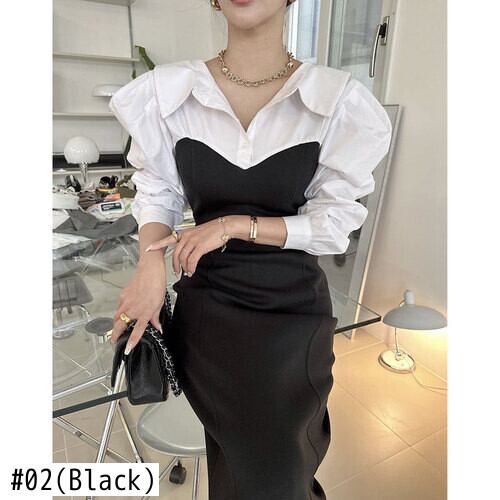 フレンチラペルコントラストパッチワークフェイクツーピーススリムフィットラップヒップ黒白シャツドレス Y2k ローブ Vestidos ホワイト ブラック