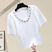 クロップドセーター服 V ビーズプルオーバーパフスリーブセータートップスプル Tシャツ