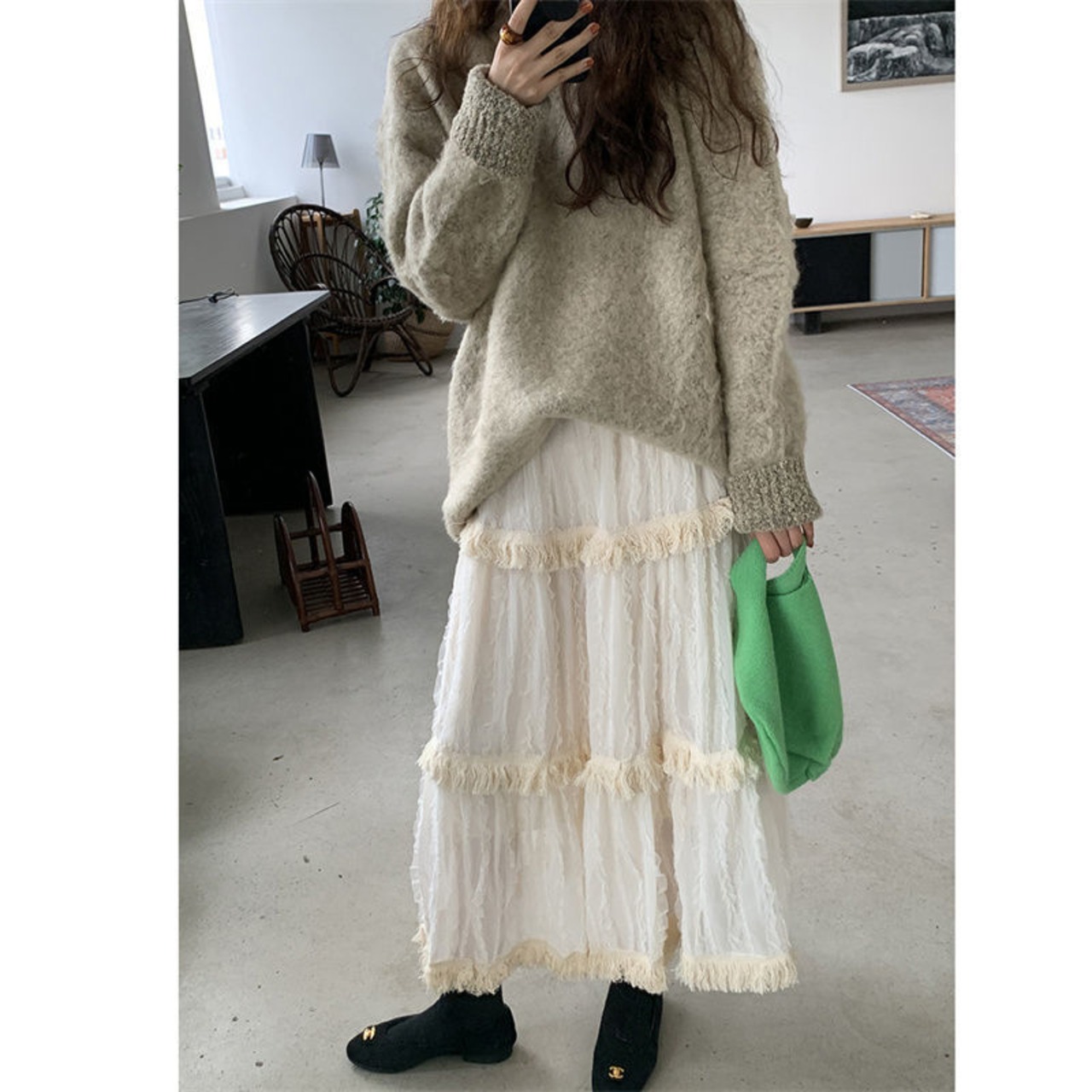 レースロングスカートかわいいウエストルーズフェアリーコアテルパッチワーク A ラインミディスカートガール秋段 Faldas 大人ガーリー スウィート キュート カジュアル オータム 秋物 Aライン
